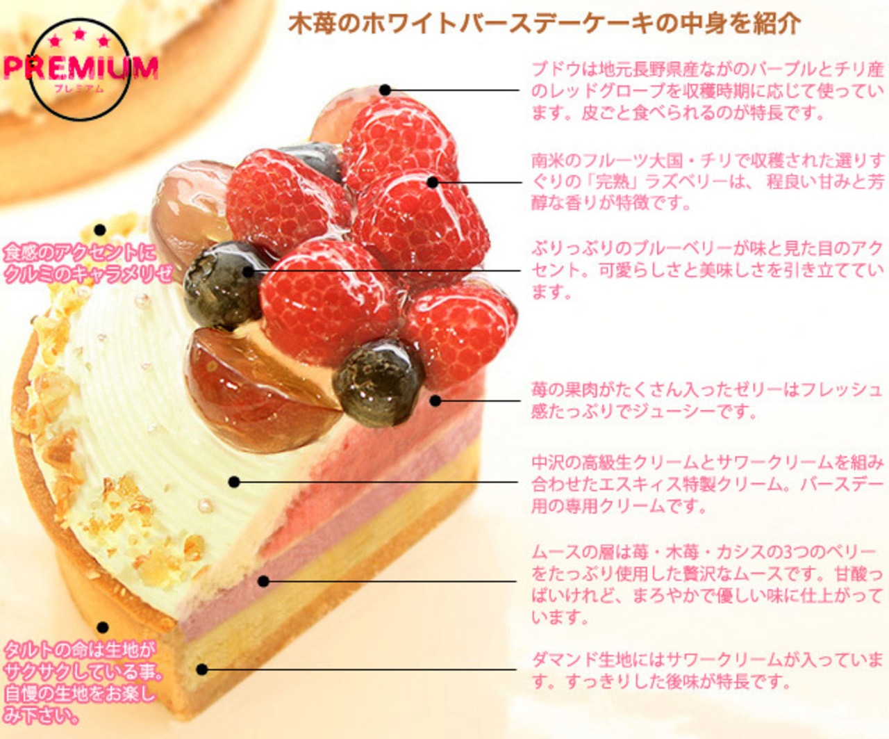 小麦粉 卵 バター 砂糖 牛乳 ピューレ アーモンドプードル ゼラチン 生クリーム サワークリーム はちみつ リキュール 苺 木苺 ぶどう アラザン くるみ